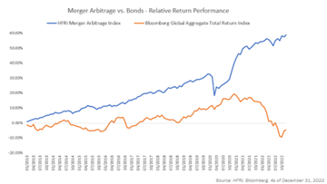 You could say this is a “good news/bad news” story. First the good news: alternative strategies, such as merger arbitrage, can be an excellent portfolio diversifier, and potentially superior to the traditional 60/40 equity/bond portfolio which suffered big losses in 2022 and could do so again. But many investors don’t fully understand merger arbitrage and its benefits.