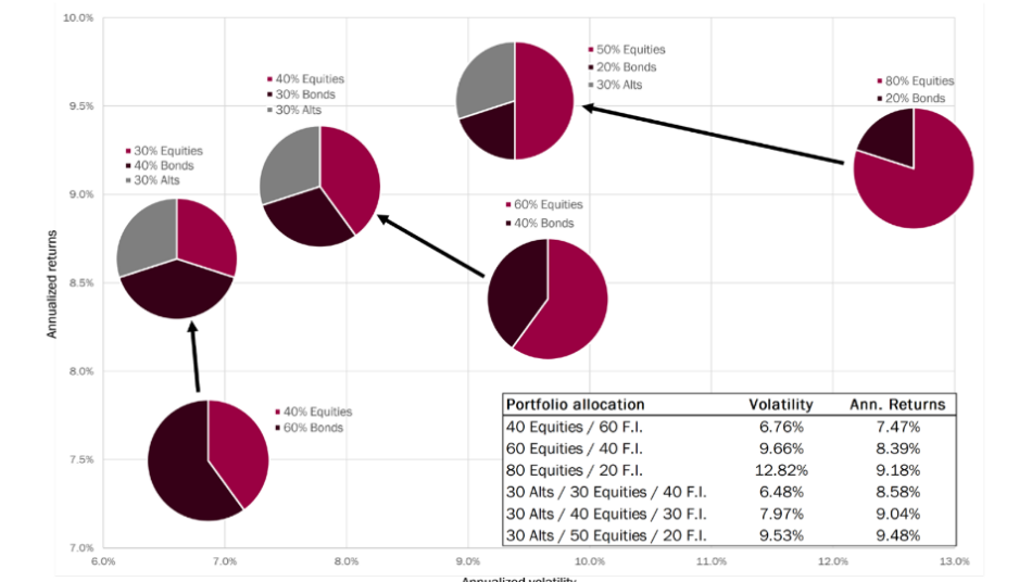 Alternatives and portfolio risk/return & Annualized volatility and returns, 1989-2Q22